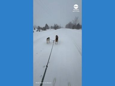 WATCH: Woman gets towed on skis by dogs amid blizzard