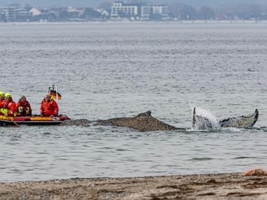 Rescue teams in northern Germany are working to refloat a humpback whale stranded in shallow water in the Baltic Sea |